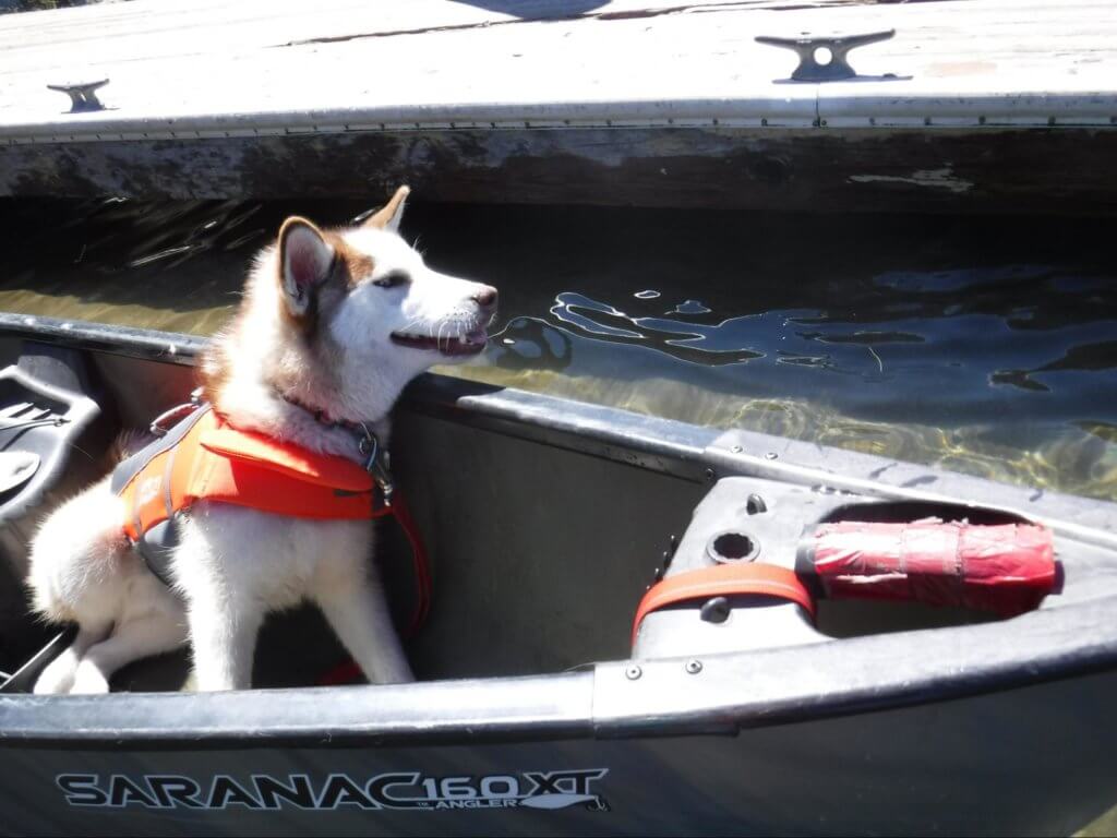 Only one dog in the group had any experience being in a canoe or kayak, so we decided to first go out in the canoe with me and one of my dogs and another person with one of their dogs. After some trial and error, we loaded up the dogs and human passengers in the canoe at the shallowest end of the boat ramp with the canoe resting on the bottom of the concrete ramp. I dragged the canoe out to deeper water then jumped in. I’m using “jump” loosely here, it was more like a clumsy scramble but the dogs seemed calmer this way having a more stable start.