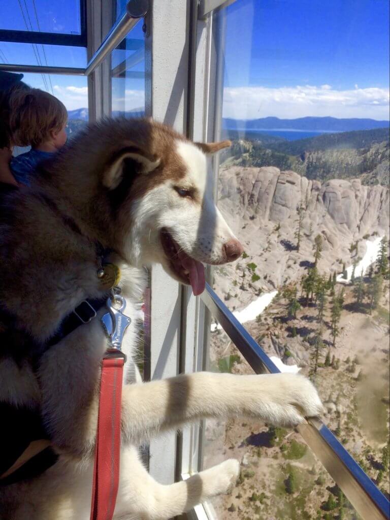 The aerial tram didn’t have wrap around floor to ceiling clear windows so the dogs couldn’t look out unless they were by the door or at the ends which had the only seats. Although the ride up and down wasn’t packed tight, it was crowded so be sure that your dog is comfortable in tight spaces surrounded by strangers. The trade-off with the aerial tram versus the traditional Gondolas is stability, you don’t feel the swings as much as the smaller gondolas but you don’t get the privacy and views of the smaller gondola cabins.