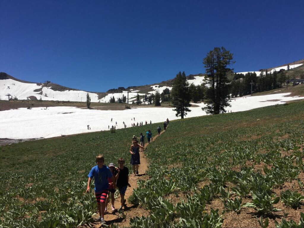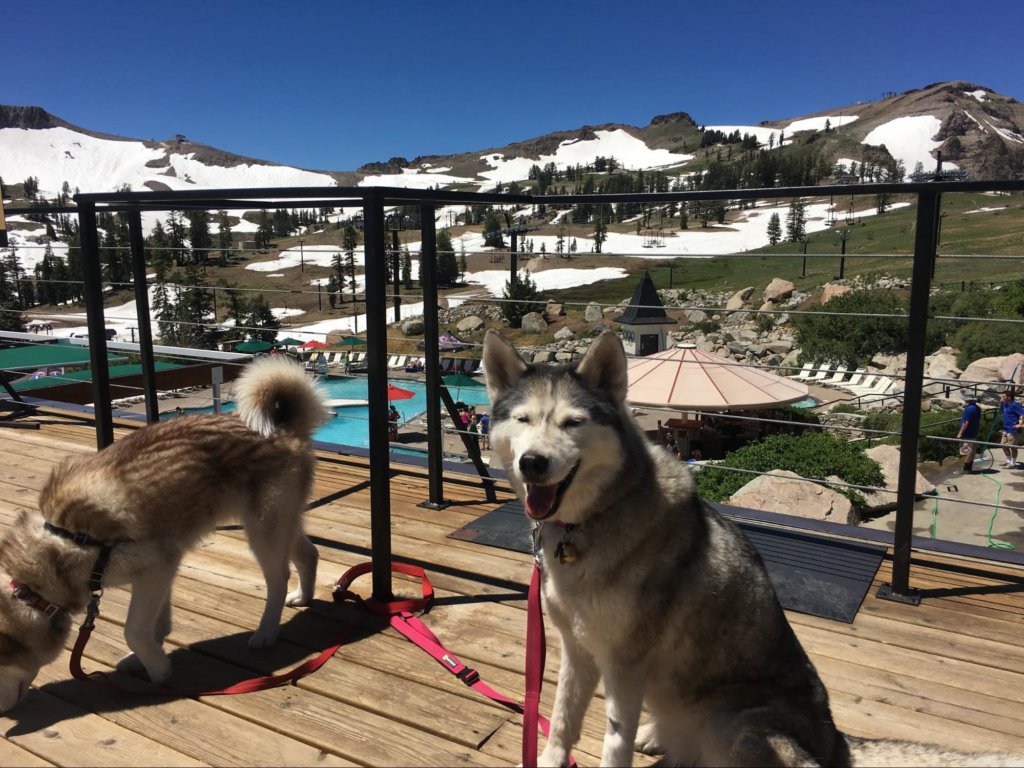 We reached the snow patch and the dogs were overjoyed to be stepping on snow. Unfortunately, we were the only ones with the proper footwear for snow to continue on as there was no way around the snow patch. We parted ways with the rest of the group and agreed to meet up later. By the way, cell reception up there is excellent, so no worries if your group wants to split up. We followed the trail admiring the Sierra views. I’ve never been to a snow resort in the summer and it’s pretty neat to see everything without the snow. We decided to turn around when the temperature started to quickly rise. The hike down is just as beautiful as the hike up, we got to enjoy views from both sides of the mountain. If you don’t have a dog or have someone to watch your dog, be sure to check out the High Camp Cafe where you can enjoy outdoor swimming or soak in a hot tub at 8200 feet.